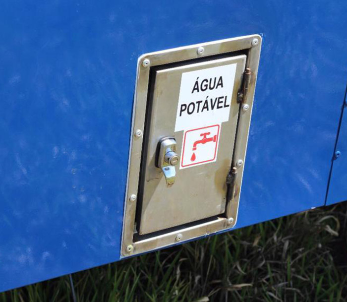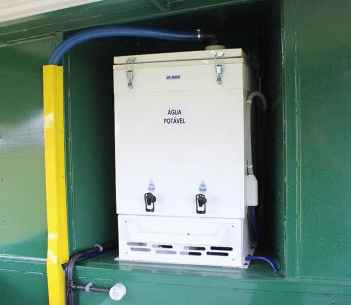 Geladeira de agua refrigerada: caixa de agua potvel em ao inox 304, revestida com ao carbono 14, espuma de poliuretano, capacidade de 200 litros, com sistema de refrigerao tocado pelo motor e caixa sada d agua em inox.